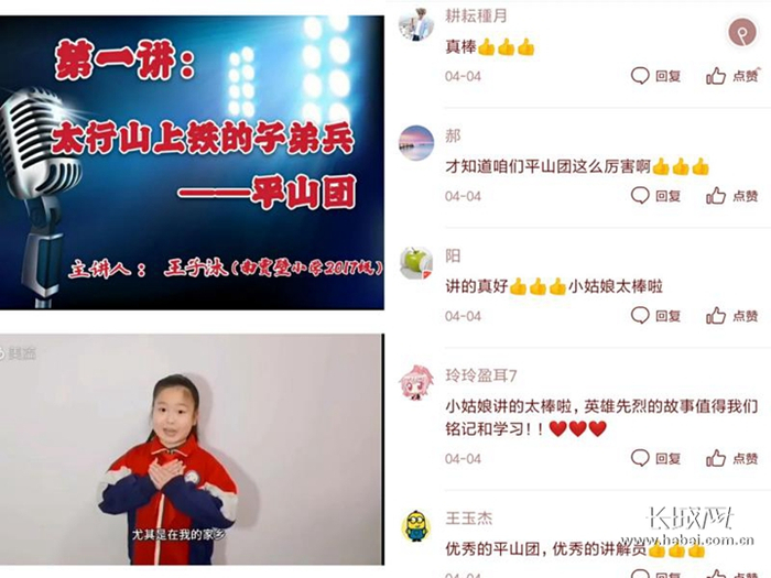 4月4日,三年级7班王子沐在“平山团”集结地洪子店讲《太行山上铁的子弟兵——平山团》,带同学们一起感受平山热血男儿奔赴国难,救亡图存的感人场景,是学校推出的第一堂“红色故事我来讲”红色网课。此后,南贾壁小学每周都要让一名红领巾宣讲员出镜讲红色故事,目前这样的红色网课已上5节了。