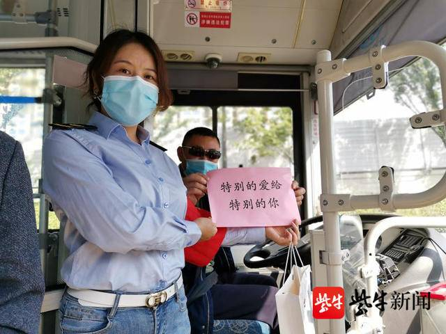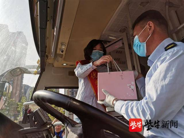 不仅如此,520,也是南京公交的“公交驾驶员关爱日”。当天早晨七点三十分,公交平安志愿者们来到龙池路地铁站,为520路候车乘客维持上车秩序,协助公交驾驶员清点上车人数,督促乘客佩戴口罩乘车。车队工作人员将装着苹果、清凉油、矿泉水的“安全大礼包”送到驾驶员手中。
