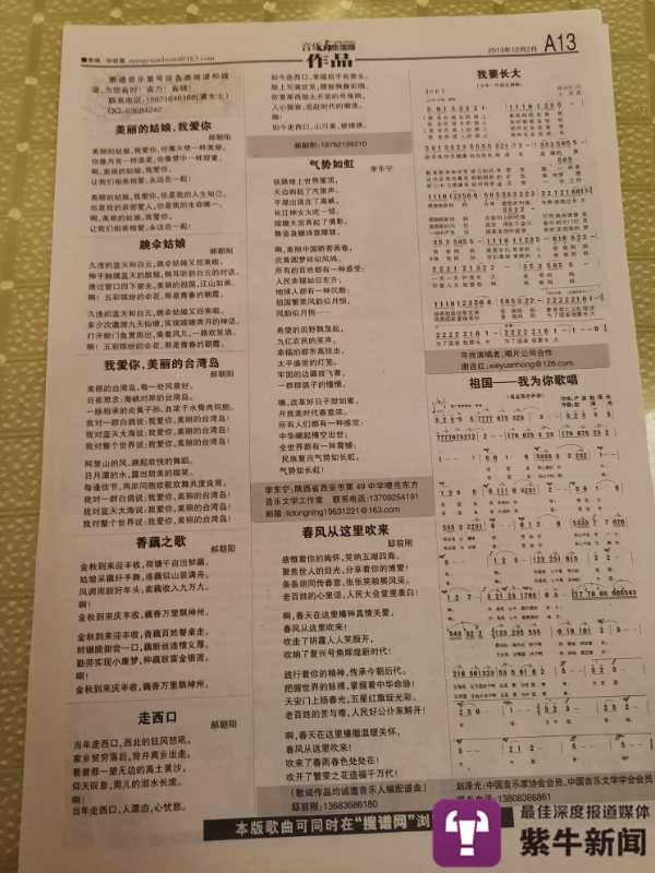 他告诉紫牛新闻记者,最初觉得作品能在报纸上发表出来已经很好了,后来还是受到别人的启发才萌生了谱曲传唱的想法。“有一次发现我在报纸上发表的歌词《回家》被人谱成了曲子,当时高兴得不得了,还专门联系去感谢人家,问要不要钱。后来才意识到,自己辛辛苦苦创作出来的作品无偿给别人还不如自己完成后续过程申请自己的版权呢。”