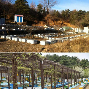 ▲拼版照片: 上图是2012年拍摄的密云区蜜蜂大世界园区内的蜂场(受访者供图);下图是2020年4月15日拍摄的密云区蜜蜂大世界园区内的蜂场(新华社发 陈钟昊摄)。