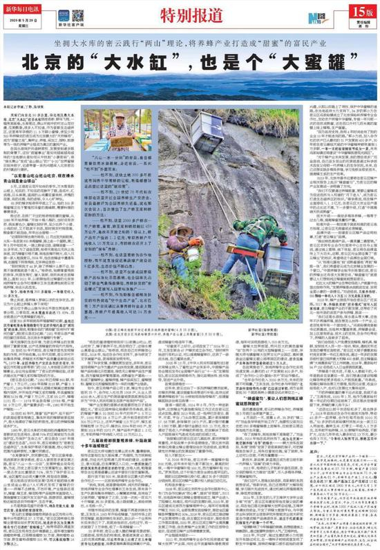 天安门向东北90多公里,华北地区最大水库、北京“大水缸”密云水库烟波浩渺、群鸟飞翔,一幅秀美画卷。水库周边,燕山环抱中的村庄山花烂漫、瓜果飘香。很多人不知道,作为首都生态涵养区,这里常年孕育的11.5万群小蜜蜂,使至少有300年养蜂史的密云成为北京最大的“天然蜂场”,成为“甜蜜之地”,集种业、养殖、深加工、授粉、旅游等为一体的养蜂产业链成为真正的富民产业。