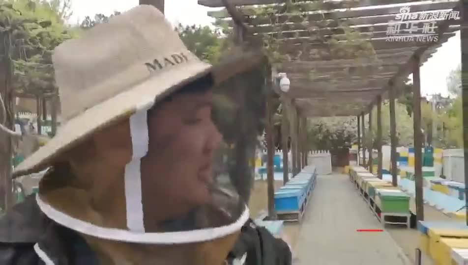 ▲密云蜂农杨新宇向记者展示他养殖的蜜蜂(4月15日摄)。新华社发(陈钟昊摄)