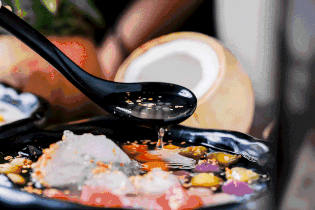 清凉略苦的龟苓膏,与“浓情蜜意”红豆、蜂蜜,互相缠绕牵引着。
