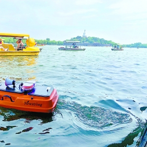 身长只有1.2米的无人巡河船在游船之间穿梭自如。通讯员 陈硕摄