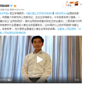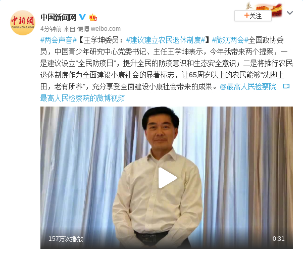 全国政协委员,中国青少年研究中心党委书记、主任王学坤表示,今年我带来两个提案,一是建议设立“全民防疫日”,提升全民的防疫意识和生态安全意识;二是将推行农民退休制度作为全面建设小康社会的显著标志,让65周岁以上的农民能够“洗脚上田,老有所养”,充分享受全面建设小康社会带来的成果。@最高人民检察院
