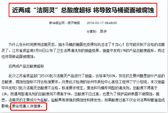 市面上的洁厕灵,近两成产品总酸度超标,你平时在用的可能是不合格的产品,大家可要提高警惕了。