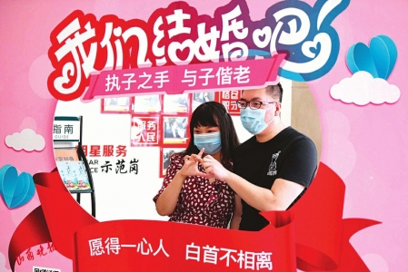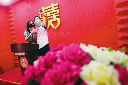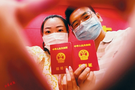 山西晚报讯(记者 郭卫艳)“真快呢,10分钟就领到证了!”5月20日,太原市迎泽区政务服务中心,刚刚领到结婚证的小林对着妻子说。2020年5月20日,因谐音是“爱你爱你我爱你”,被许多准新人视为难得一遇的好日子。出于疫情防控需要,太原市各个婚姻登记处推出提前预约婚姻登记服务。
