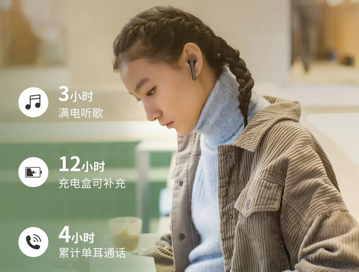 耳机充满一次可连续播放音乐3小时,充电盒可为耳机额外充满4次。