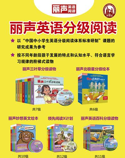 丽声英语启蒙阅读主要针对0-6岁孩子,帮助孩子进行英语启蒙,语感感知,开启英语世界的大门,代表产品有《丽声我的第一套鹅妈妈童谣》、《丽声我的第一套拼读英文绘本》等;丽声英语自然拼读重点培养孩子见词能读、听音能写的能力,帮助孩子顺利完成从不会到会的英语“识字”过程,代表产品有《丽声瑞格叔叔自然拼读法》、《丽声拼读故事会》、《丽声北极星自然拼读绘本》等;丽声英语分级阅读让孩子根据自己的能力选择合适的级别进行学习,拾级而上,逐级递进,代表产品有《丽声北极星分极绘本》、《丽声三叶草分级读物》、《丽声妙想英文绘本》等。