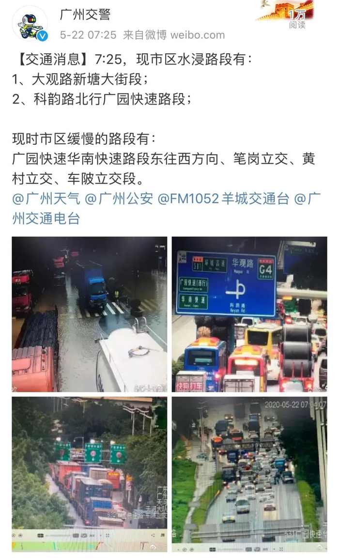 据@广州交警 7点25分发布消息,广州市区水浸路段有:大观路新塘大街段;科韵路北行广园快速路段。广州市区缓慢的路段有:广园快速华南快速路段东往西方向、笔岗立交、黄村立交、车陂立交段。