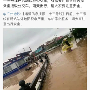 6点14分发布消息:受暴雨影响,官湖站外地面积水严重,雨水倒灌进隧道导致无法出车,目前,13号线暂停运营,并已启动地面公交接驳。地铁方面正在加紧排水抢修。请需要搭乘13号线的乘客改乘其他交通工具,给您出行带来的不便,我们深表歉意!