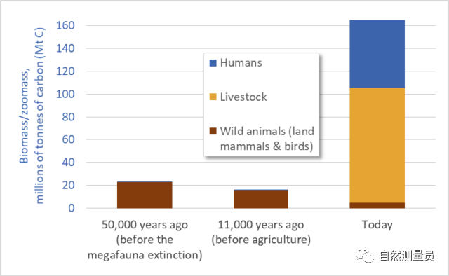 作为对比,超过6000种野生哺乳动物所有物种加在一起,碳总量只有0.07亿吨。1:0.07,这个几乎惊人的比值,意味着从陆地到海洋,整个星球上所有哺乳动物的分量中,超过93%由人类和家畜组成。