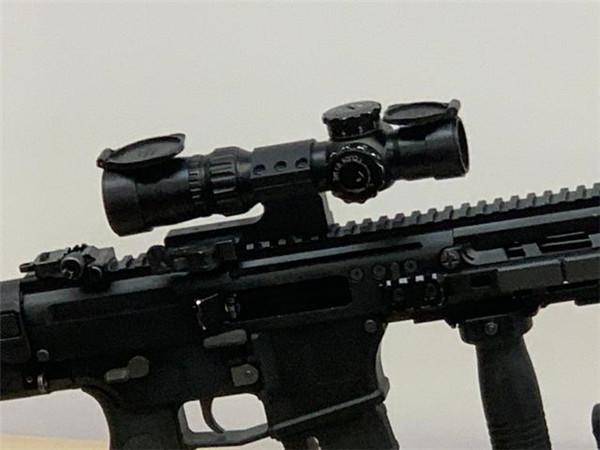 20式突击步枪上机匣后面的觇孔照门、前面的机械式准星都设计为翻倒式,这也表明该枪不再以传统瞄具为主,而是以上机匣皮轨固定的光学瞄具为主。从展示情况看,该枪配的是可调倍率白光瞄准镜(1-8×),当然也可换装微光、热成像等其他瞄具。