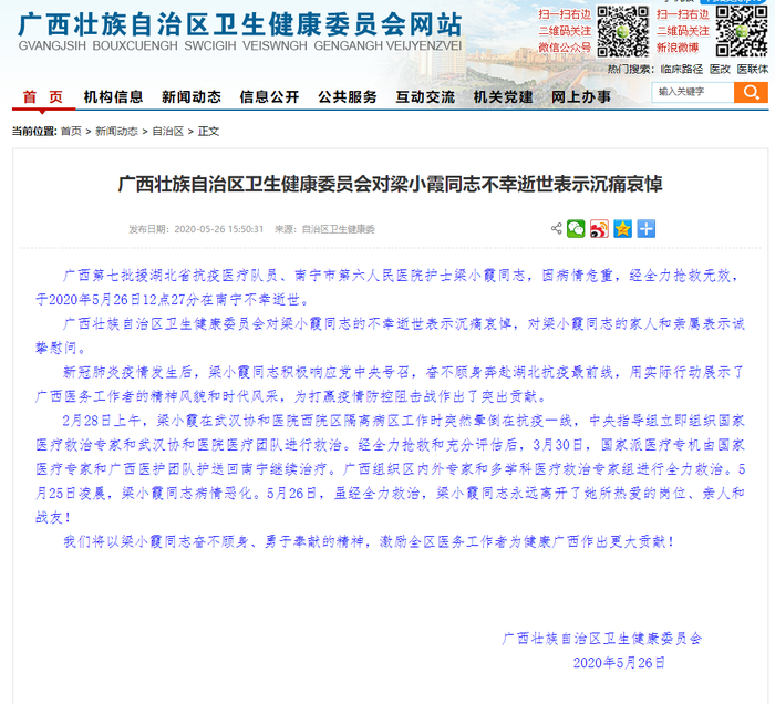 据广西卫健委消息,广西第七批援湖北省抗疫医疗队员、南宁市第六人民医院护士梁小霞同志,因病情危重,经全力抢救无效,于2020年5月26日12点27分在南宁不幸逝世。