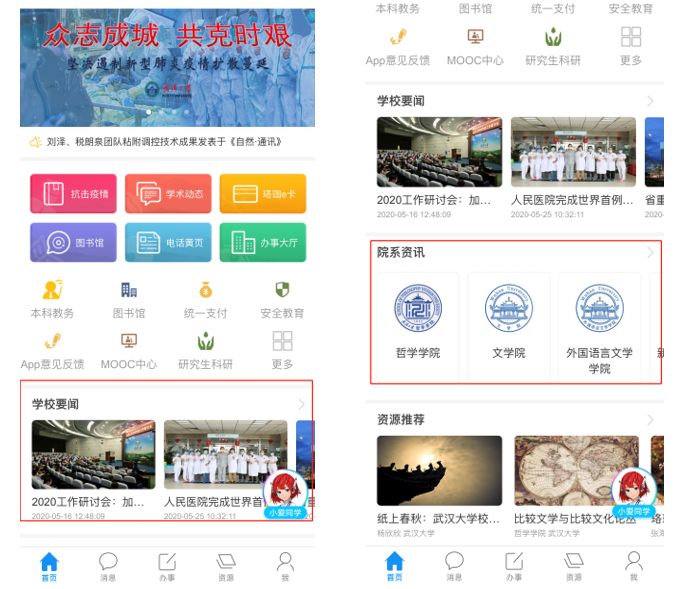 在APP首页新增“院系资讯”栏目,将院系工作动态接入智慧珞珈APP首页,并实现师生本人所在学院(系)始终置于最前端醒目位置,既方便师生查阅本学院(系)相关信息,同时也为学院(系)展示工作提供了公共平台。