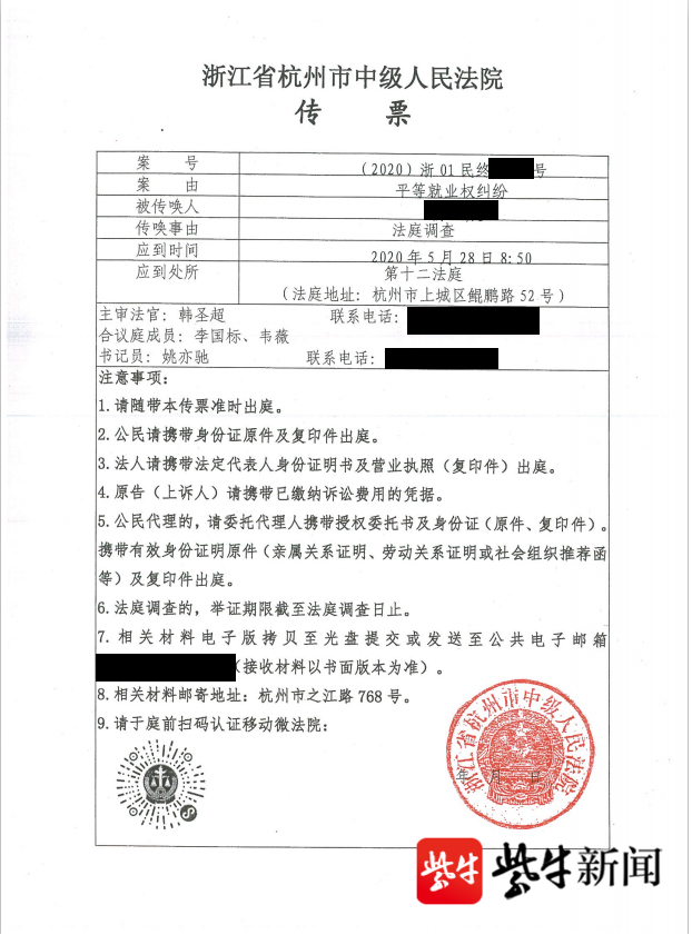 2019年12月3日上午,杭州市滨江区人民法院浦沿法庭开庭审理了此案,当天未宣判。