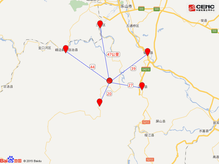周边县城:震中距马边彝族自治县20公里、距沐川县27公里、距犍为县39公里、距峨边彝族自治县44公里、距沙湾区47公里,距乐山市63公里,距成都市189公里。