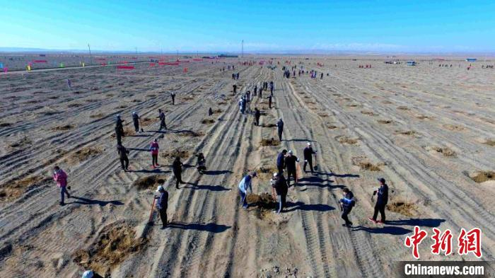 金塔县民众栽胡杨、种梭梭、调柴草、固沙丘,不仅筑起绿色长城,还把荒漠化治理与生态经济结合起来,发展沙产业。(资料图) 金塔县委宣传部供图