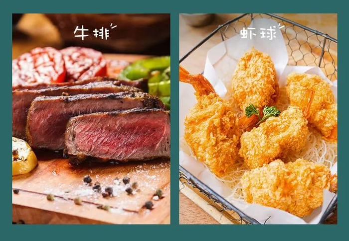 轮到正餐,煎牛排、虾球,也同样鲜嫩多汁,就像西餐厅大厨做的一样好吃!