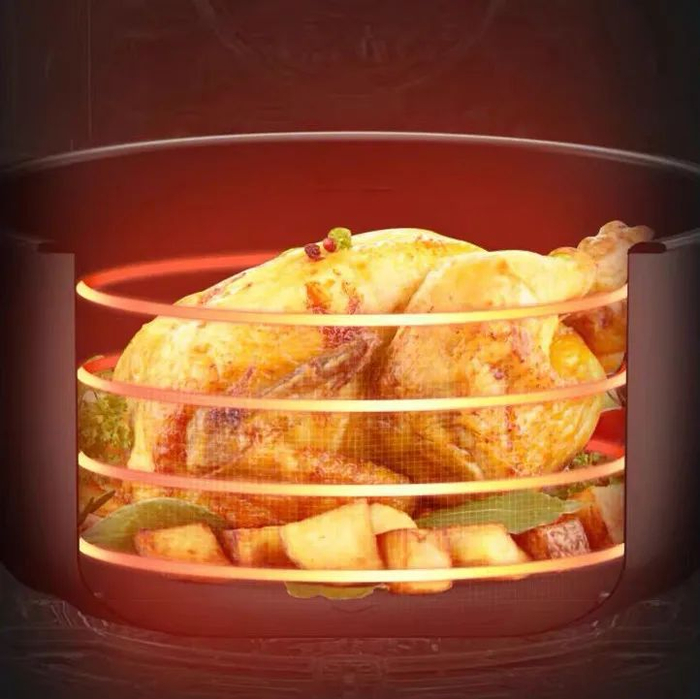 烹饪时,空气热流会在锅内掀起一阵“龙卷风暴”,只带走食物表面的水分,形成酥脆的表皮,锁住里面的鲜嫩汁水。