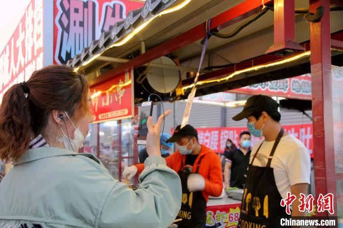 5月26日晚,济南环联商贸城夜市烟火气重“燃”。市民开启“逛吃”模式的同时,疫情防控意识不松懈。市民佩戴口罩,扫码付款,减少人与人之间的直接接触。 孙宏瑗 摄