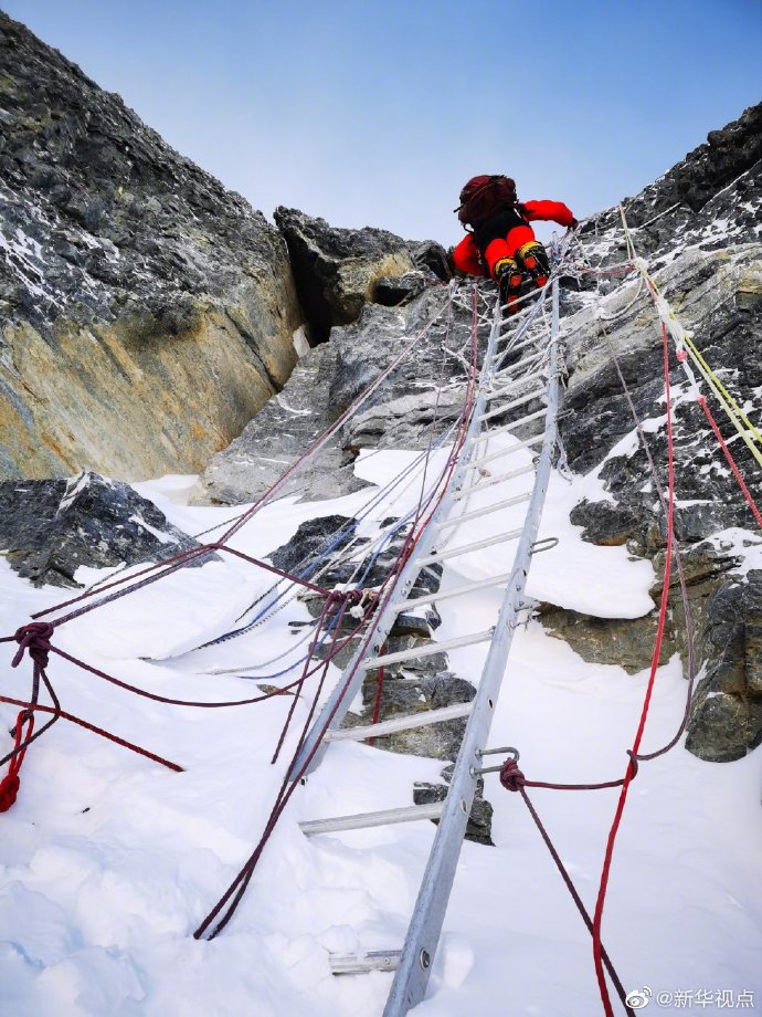 第二台阶在海拔8600米处开始,是登山者从北坡登顶珠峰的难点之一。这是一道高数米、几乎垂直的岩壁,极难寻找攀爬支撑点。1960年,中国登山队队员刘连满甘当人梯,让队友踩着自己的肩膀通过,成功跨越第二台阶。通过第二台阶后,还有最后一道“鬼门关”——横切路线,一段仅能供一人通过的岩石绝壁。通过后,峰顶便近在眼前!(记者边巴次仁、王沁鸥、魏玉坤、武思宇;特约记者扎西次仁 摄)