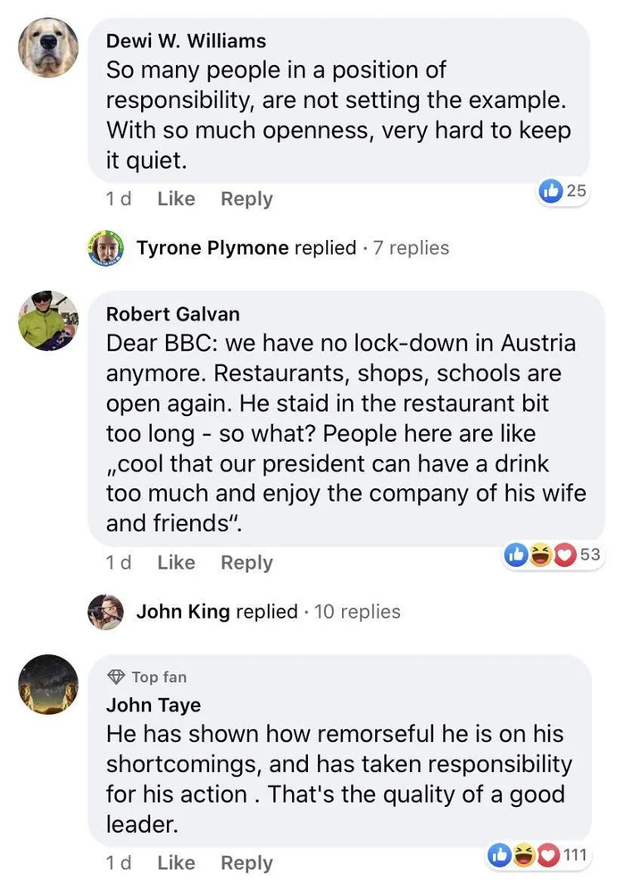 在奥地利之外,“奥总统带头违反宵禁”的事引起大量英国网民的高度关注——此前,英国首相高级顾问多米尼克·卡明斯被发现在封城令实施期间且在自己已经出现症状时,依然离开伦敦前往英格兰北部城市达勒姆,就此引发巨大争议,但迄今他依然表示自己没有犯错,也不会辞职。此外,还有几名议员也被发现在封城期间出行参加群体活动。借奥地利总统道歉之机,英国网民再次评论称,“就算他们的行为不违反法律,也应该像奥地利总统一样真诚道歉。”