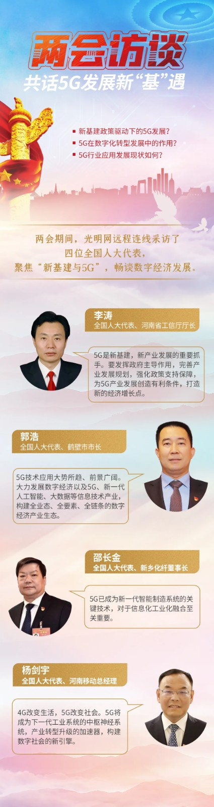 各位网友大家好,欢迎来到光明网的两会访谈间。两会期间,有关新基建、5G的话题颇受关注。为此,我们邀请到了四位全国人大代表,他们分别是河南省工信厅厅长李涛、鹤壁市市长郭浩、新乡化纤(3.310, -0.05, -1.49%)董事长邵长金、河南移动总经理杨剑宇。