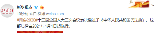 十三届全国人大三次会议表决通过了《中华人民共和国民法典》 新华社 新华社官方账号 05月28日15:08 关注 听新闻 十三届全国人大三次会议表决通过了《中华人民共和国民法典》。这部法律自2021年1月1日起施行。