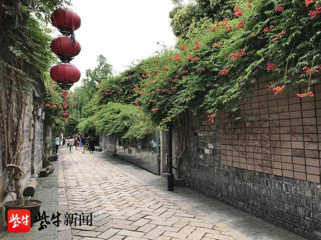 今天上午,记者来到老门东,三条营一路的围墙上都攀援着凌霄花。凌霄花乍一看有点像石榴花,二者都是火红的一片,花朵好似张开的小喇叭。茂密的凌霄藤爬满古宅屋沿、院门,从墙上探出可爱的橙色花朵。在南京,凌霄花有很多,大多数攀附在古老的明城墙上。人们在中华门城堡、草场门南艺围墙以及老门东的青墙砖上,都能看见灿烂的凌霄花。