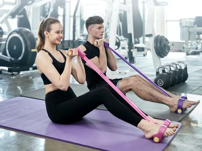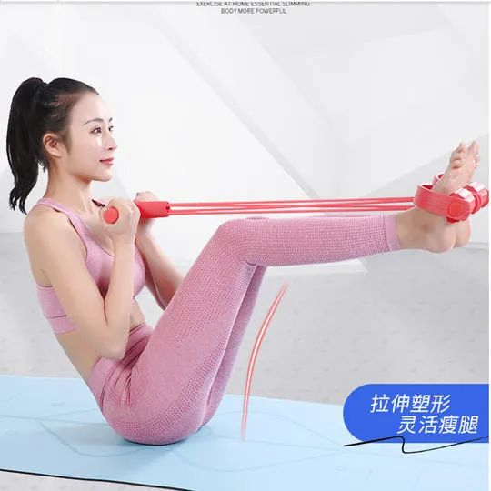 瘦腿也是非常重要的,瘦腿拉伸,双脚踩住拉力器脚蹬,进行来回的弯曲拉伸,臀部与地面45°,一组20个,每天3组。