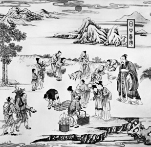 传说神农教人们种田和养殖后,人们生产出来的产品也越来越多。由于人们居住环境的不同,物产也不一样,有的种五谷,有的狩猎为生,有的捕鱼为主,有的制陶为业。产品有了盈余,对互相交换产品的需求越来越强。于是炎帝部落实行了“日中为市”,就是在每日中午的时候开市进行交易。因为当时没有计时器,唯有太阳当顶这个时刻最便于大家共同掌握。在此之前,各部落的先民带着自己的剩余产品从四面八方赶往市集,待到正午开市,便选定自己所需的产品,谈判协商,各取所需,相互交换,直到换回自己满意的物品。