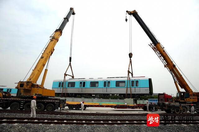 5月28日,常州地铁2号线电客车“蓝精灵”顺利抵常。上午十点,记者在现场看到,地铁2号线——“蓝精灵”正在丁堰车辆段进行吊装和拼接,完成后将由工程车拉到检修库,顺利“安家”,下一步将进行带电精调。