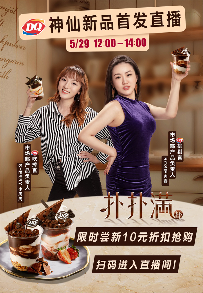 扑扑满在上市初期也采用了最近广为流行的直播营销,DQ所属的CFB集团在直播策略采取的方式除了与平台合作外,全力经营私域流量,在自己的微信直播平台上,采取多场景与创新内容的手段,经营与粉丝的互动,5月29日推出的DQ 全球首发新冰品“扑扑满”直播,不走一般“叫卖带货型”的直播路线,而是由DQ市场部及研发部的人设化主播亲自演绎精彩的产品故事,更强调内容与互动,在自有直播平台上吸引了大量的粉丝观赏,同时也在820家门店的电子点餐LED屏同步直播,开创持续性直播粉丝人群经营的蹊径。