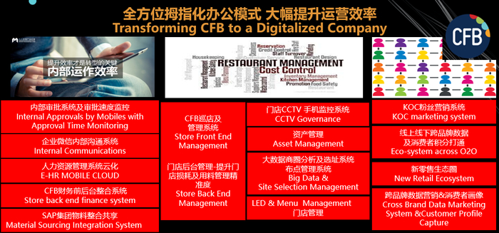 根据旗下拥有DQ、棒约翰、Brut Eatery悦璞食堂以及遇见小面等餐饮品牌的CFB集团CEO许惟抡指出,CFB集团的数字化深耕主要体现在以下几个方面:第一是拇指化办公模式,从内部运作的审批流程、内部沟通、休假管理、人事薪资等系统到门店管理的巡查管理、资产盘点、CCTV监看、地图布点、点餐电子屏等系统,全面实现手机操作,大幅提高效率;第二是大数据营销系统,全集团实现了跨品牌会员数据与积分打通、CRM营销、自助点餐与外送小程序、线上线下跨平台数据打通;第三是天气数据集成,同步到门店管理系统,可根据天气转变及时调整策略;第四是智能选址系统,利用企业内外部数据,结合地理位置的顾客洞察、网点优化与客户价值提升等场景,精准了解市场、预测趋势、优化资源配置,提升开店成功率;第五是单店粉丝营销体系,以数字信息化将门店店长的社交群进化为可管理与统计的新微商模式,交易过程以及营销活动设置全部自动化,有效扩充私域流量。CFB集团的数字化管理与营销,以从总部到门店一线员工的全面普及化程度而言,堪称是餐饮业最前沿的集团之一。