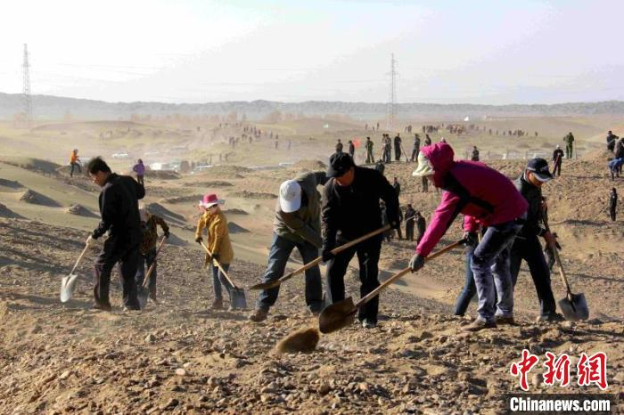 金塔县民众栽胡杨、种梭梭、调柴草、固沙丘,不仅筑起绿色长城,还把荒漠化治理与生态经济结合起来,发展沙产业(资料图) 金塔县委宣传部供图