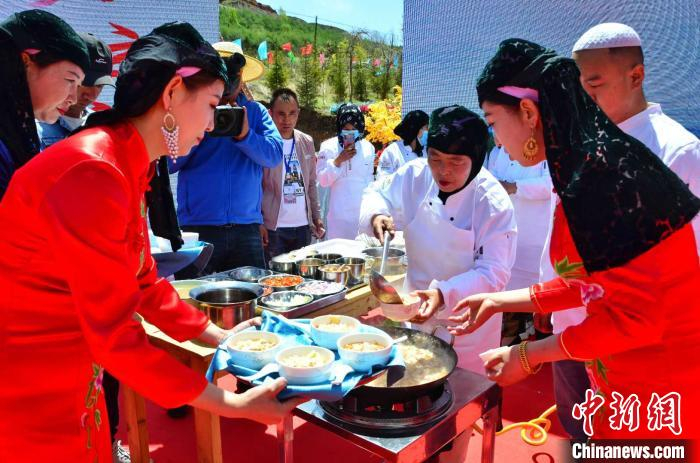 图为石碑面片传承人在青海省海东市平安区第四届乡村旅游季启动仪式现场制作石碑面片。 鲁丹阳 摄