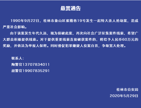 原标题:桂林警方:悬赏60万征集“朱紫巷六人被杀特大抢劫案”线索