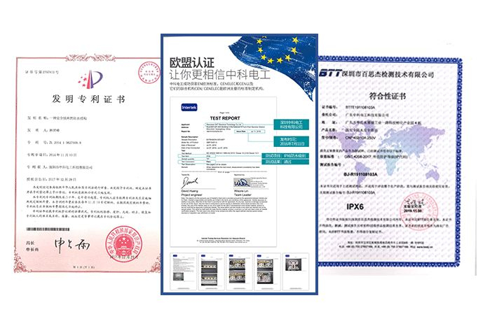 目前,中科电工加强版防水安全插排已经获得了专利认证,同时还通过了IPX6防水等级检测以及欧盟认证。