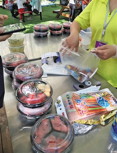 在奥林匹克森林公园乐仕堡乐园,同样存在使用超薄塑料袋的情况。昨日中午,乐园的餐饮区正在销售盒装食品,旁边放着免费的超薄塑料袋和一次性筷子。