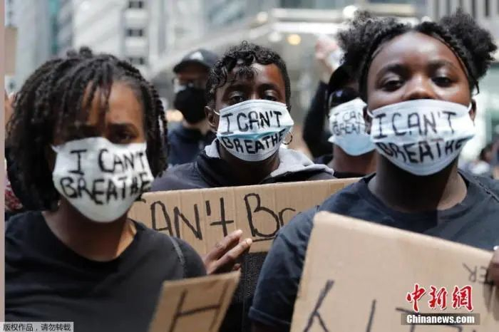 当地时间5月30日,美国芝加哥,几名抗议者戴着写有“我无法呼吸”字样的口罩走上街头抗议示威。