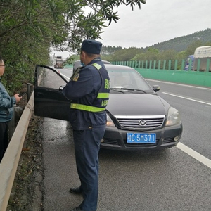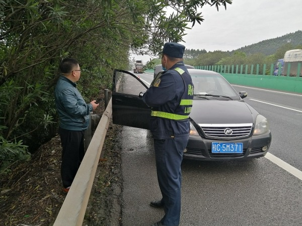 2020年4月22日上午,永福路政执法大队执法人员巡逻至G72泉南高速公路(桂柳段)柳州往桂林方向K1144+950处时,一辆车因发生故障停滞路中,车旁人员正在焦急的打电话。