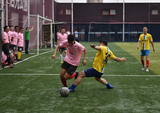 5月24日下午,杭州普天同庆足球队(粉红上衣)在与另一支业余足球队踢友谊赛。