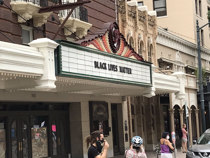电影院大屏幕播放显示“Black lives matter”,本文图片均来源于受访者