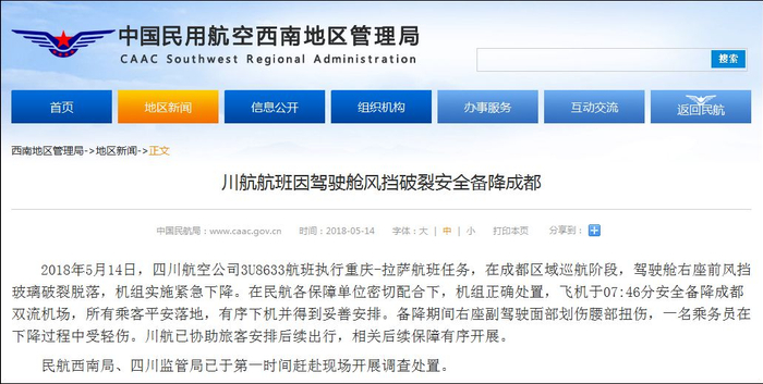 6月2日,红星新闻记者通过中国民用航空安全信息系统查询到,此前在2018年5月14日发生的川航3U8633航班备降成都事件的调查报告已经出炉。