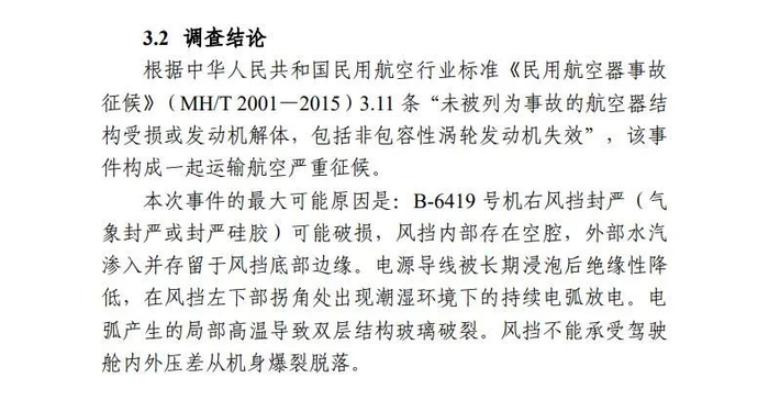 调查报告显示,本次事件的最大可能原因是:B-6419号机右风挡封严(气象封严或封严硅胶)可能破损,风挡内部存在空腔,外部水汽渗入并存留于风挡底部边缘。电源导线被长期浸泡后绝缘性降低,在风挡左下部拐角处出现潮湿环境下的持续电弧放电。电弧产生的局部高温导致双层结构玻璃破裂。风挡不能承受驾驶舱内外压差从机身爆裂脱落。