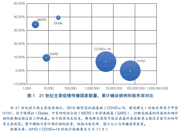这次疫情是世界上很多国家自 1918 年西班牙大流感以来最严重的疫情,也是冷战结束以来最严重的全球公共卫生突发事件。中世纪时期的黑死病和1918年西班牙大流感曾分别导致数千万人死亡,但那时人类对病毒的基本原理仍不了解。现代医疗技术和水平比百年前有了质的提高,但是包括最发达国家在内的疫情重灾国却出现前所未有的医疗系统崩溃局面,足见此次疫情的严重性。新冠肺炎疫情和21世纪前几场主要疫情在致死率和感染范围上各有异同,但其传播速度远超过其他疫情。