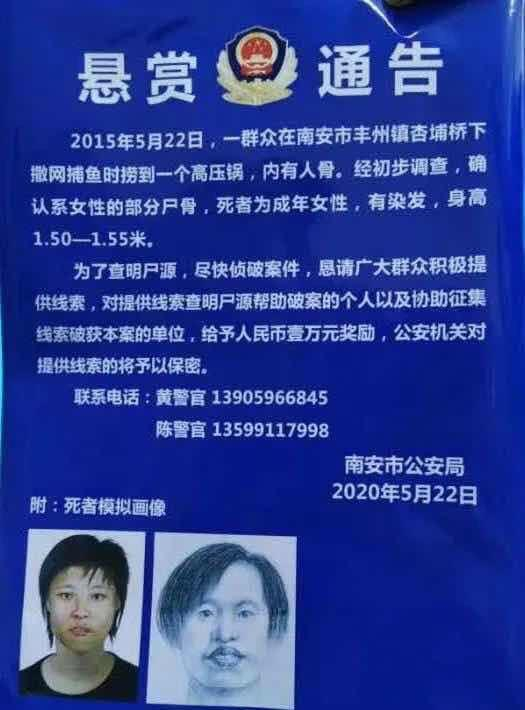 通告称,2015年5月22日,一群众在南安市丰州镇杏埔桥下撒网捕鱼时捞到一个高压锅,内有人骨。经初步调查,确认系女性死者的部分尸骨,死者为成年女性,有染发,身高1.5米~1.55米。为了查明尸源、尽快侦破案件,恳请广大群众积极提供线索,对提供线索查明尸源或帮助破案的,将给予人民币10000元奖励,公安机关对提供线索的将予以保密。
