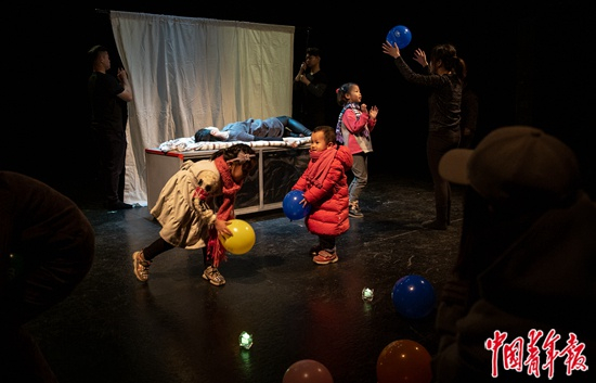 2019年12月10日,话剧《生育纪事》中,农村女孩“小玉”在剧痛中生下了孩子后,充当临时演员的孩子们走上舞台玩气球,营造出欢乐的气氛。
