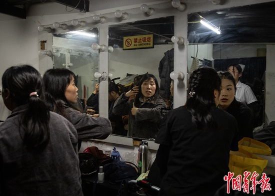 演出的剧场在二环内的著名景点南锣鼓巷附近,演员们大多在北京待了10年以上,但不少人是在演出间隙才第一次认真逛这条胡同。在剧场后台,演员们需要自行解决化妆问题。年轻的美飞还能跟大学生志愿者聊聊知名品牌的口红,其他多数演员则要互相借用化妆品,还有人只能从上舞蹈班的小女儿那里借来儿童化妆品。